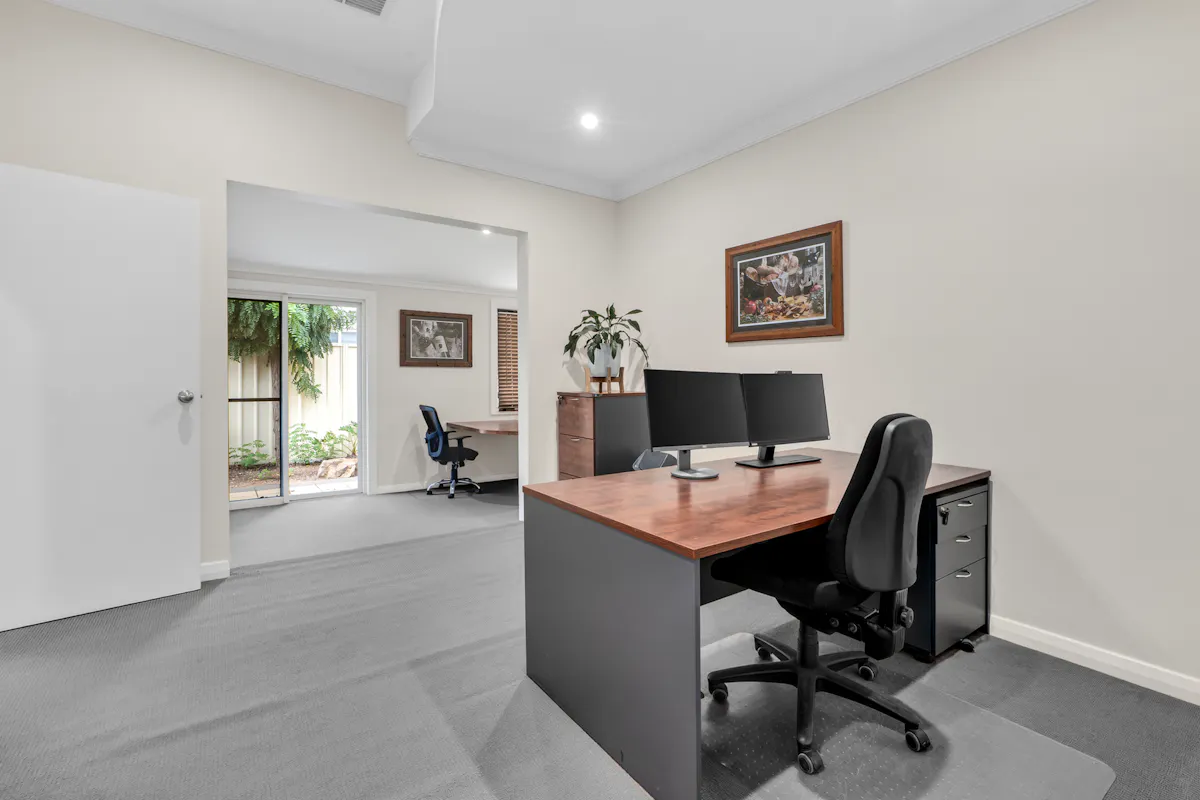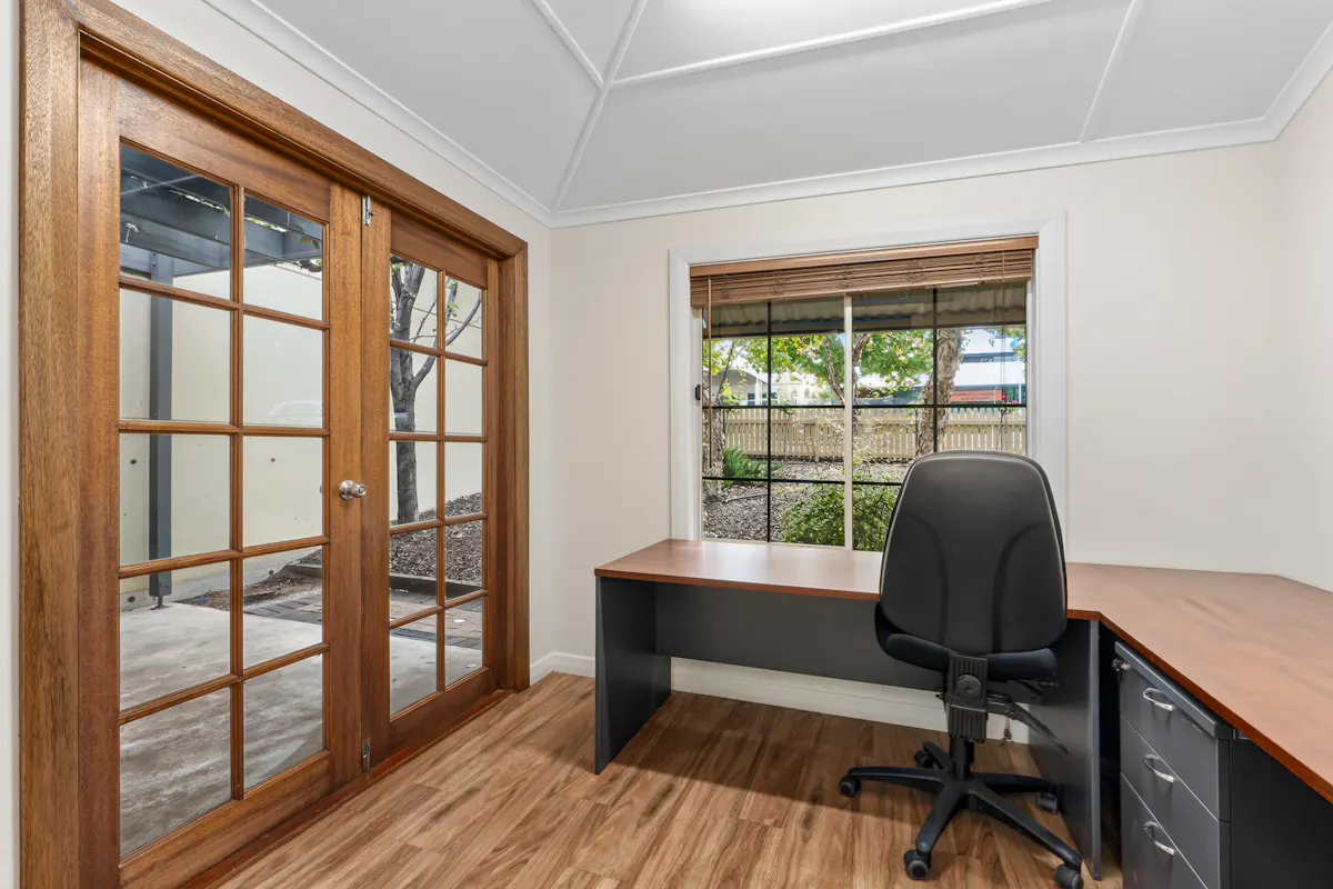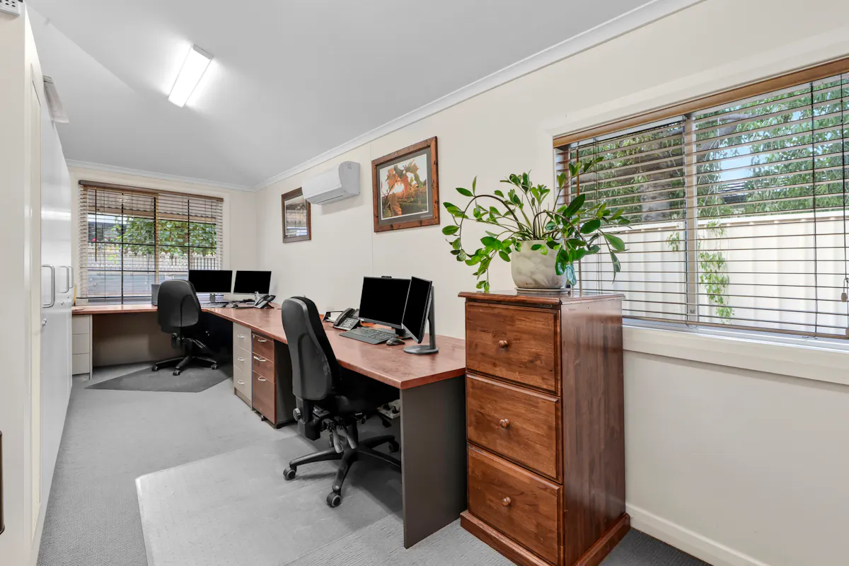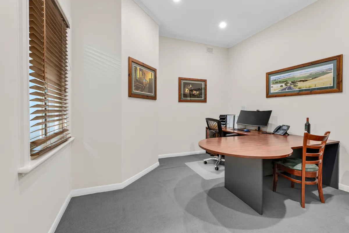 Behind the charming, vine-covered entrance, the property reveals a meticulously maintained building with a highly adaptable floor plan. Featuring up to seven offices, a spacious boardroom, utility room, kitchenette, and bathroom facilities, the layout is ideal for a range of professional, consulting or administrative uses. Year-round comfort is assured with ducted air conditioning complemented by two reverse cycle units. At the rear, a generous outdoor entertaining area provides a relaxed space for staff breaks or informal client meetings.