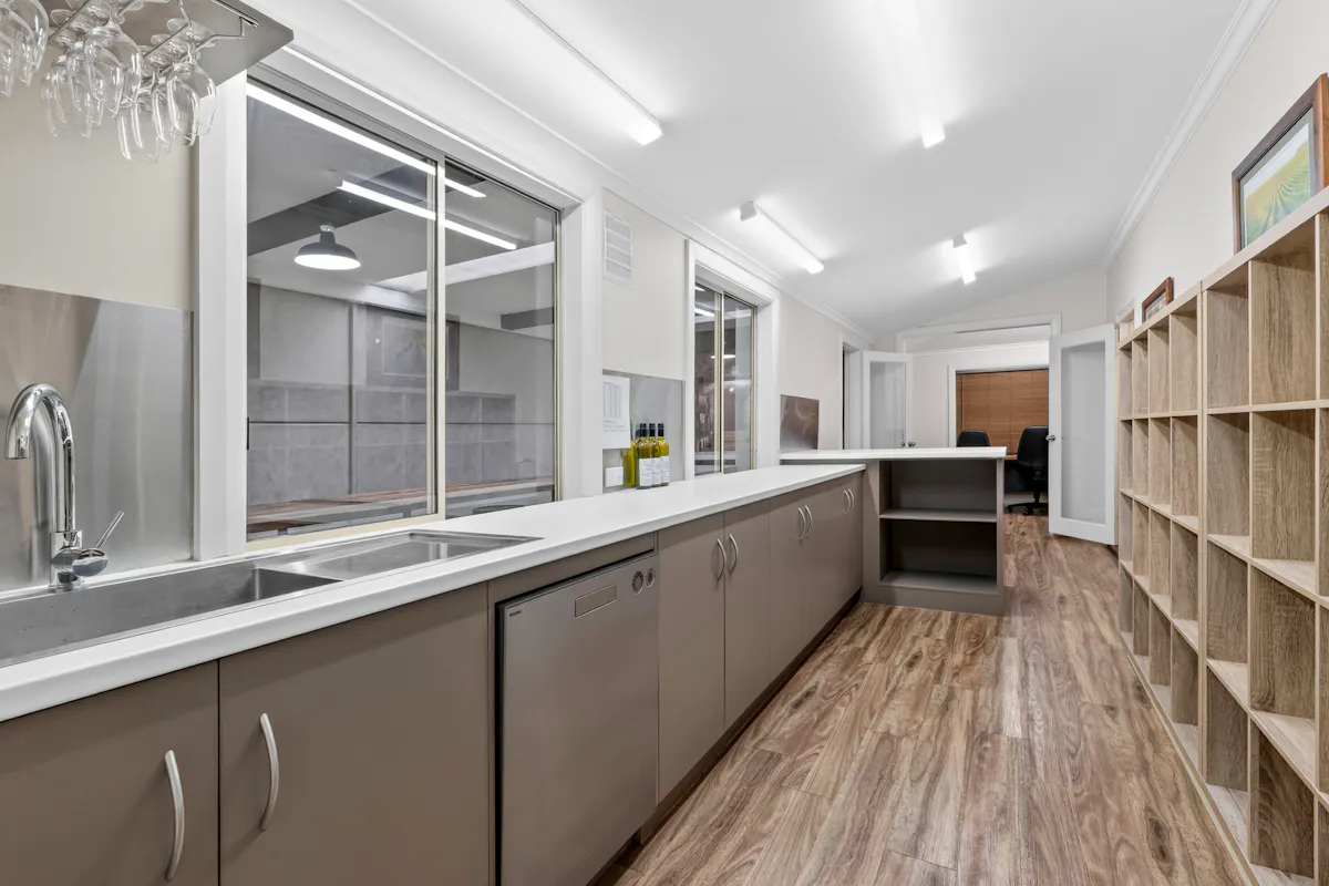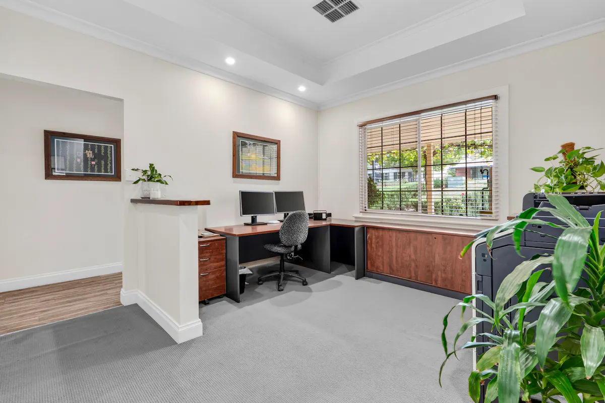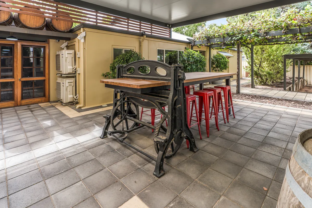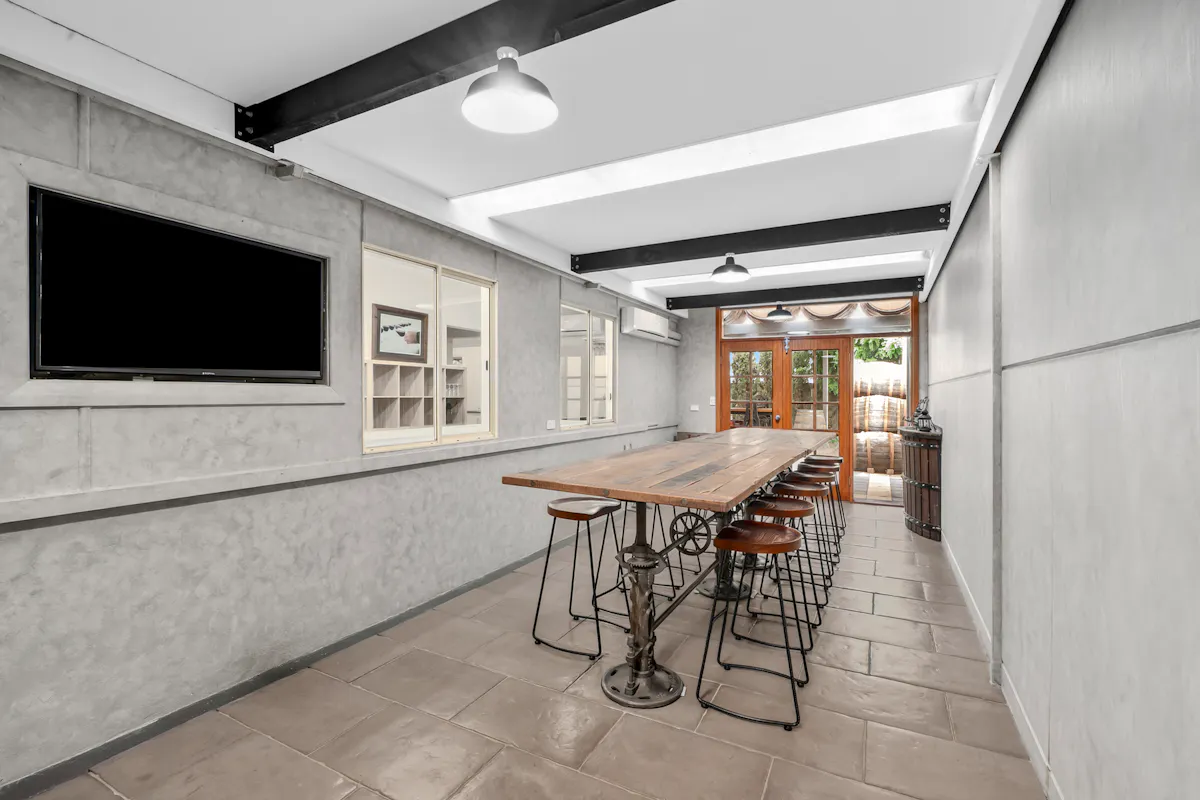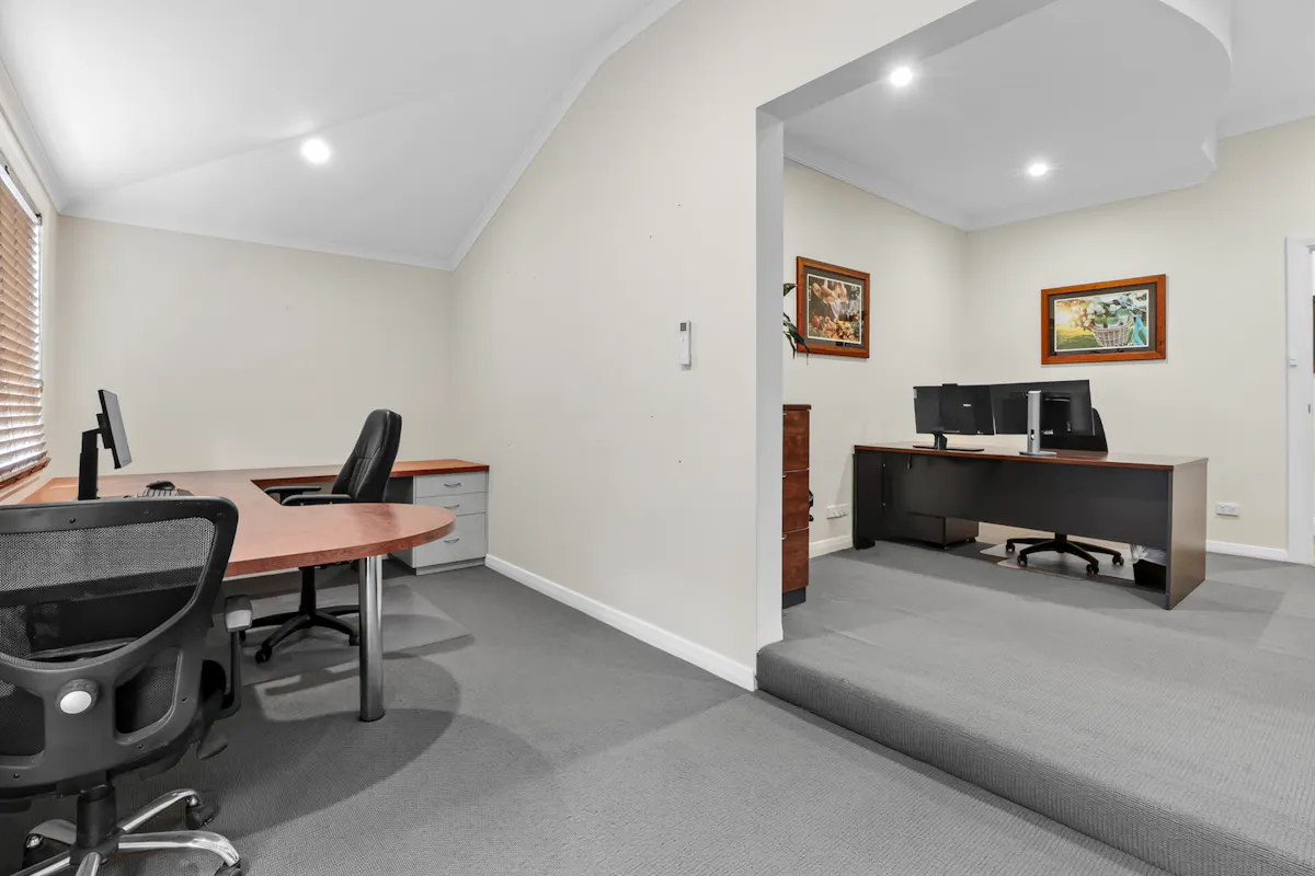 Behind the charming, vine-covered entrance, the property reveals a meticulously maintained building with a highly adaptable floor plan. Featuring up to seven offices, a spacious boardroom, utility room, kitchenette, and bathroom facilities, the layout is ideal for a range of professional, consulting or administrative uses. Year-round comfort is assured with ducted air conditioning complemented by two reverse cycle units. At the rear, a generous outdoor entertaining area provides a relaxed space for staff breaks or informal client meetings.